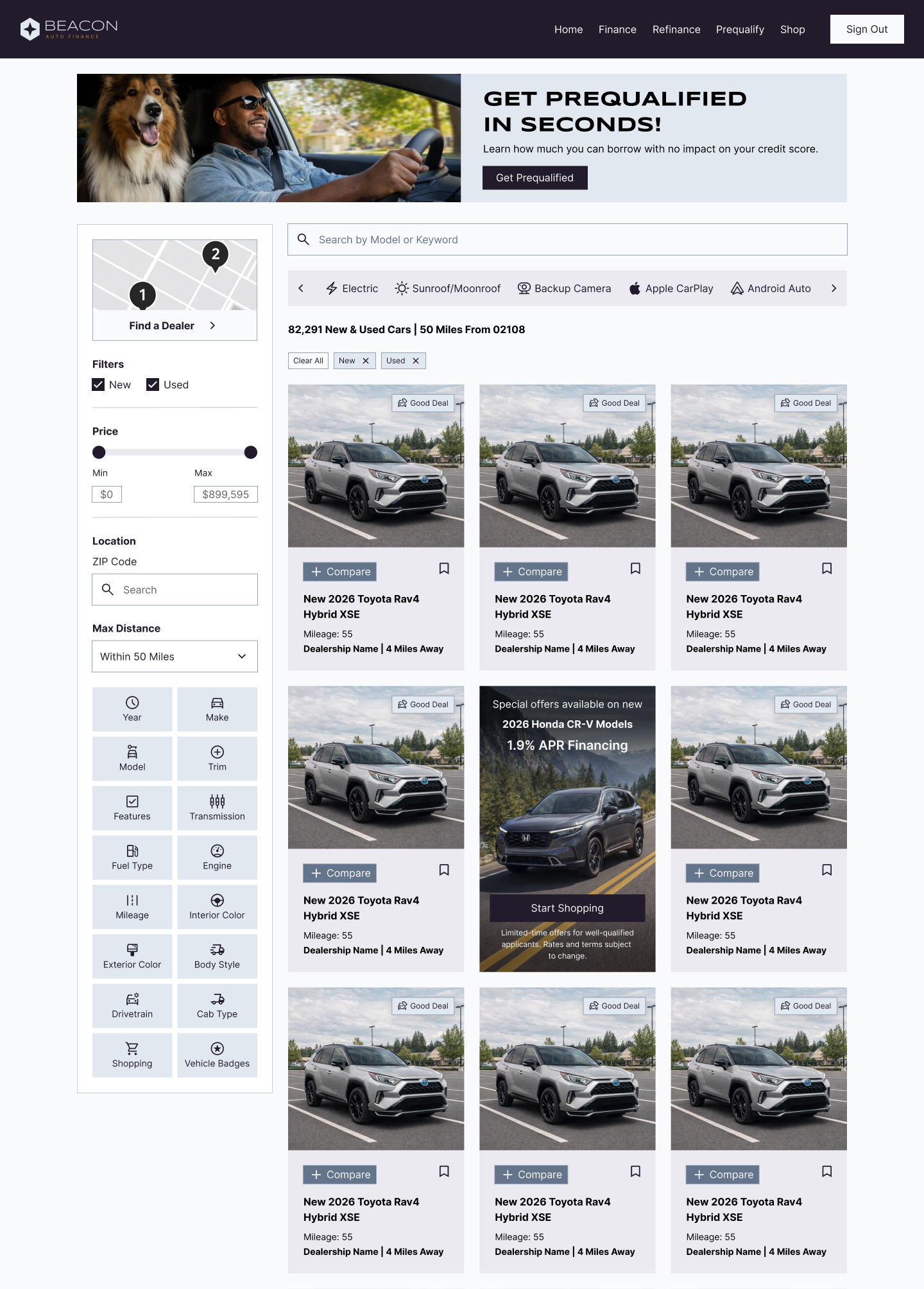 I served as the UI designer and brand liaison for Beacon Auto Finance, a white-labeled auto shopping marketplace embedded within the broader Beacon platform. My role was to bridge Beacon’s existing brand standards with the technical realities of a new platform build, translating stakeholder requirements into a cohesive, on-brand digital experience. The result was a fully launched marketplace serving Beacon customers across a network of ~4,500–5,000 partner dealers and approximately 1 million vehicles. This engagement was part of a broader set of white-label platform partnerships that collectively generated ~$1.2M in implementation fees and ~$2.9M in annual recurring revenue.